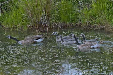 parents and goslings at Ridgefield in stream